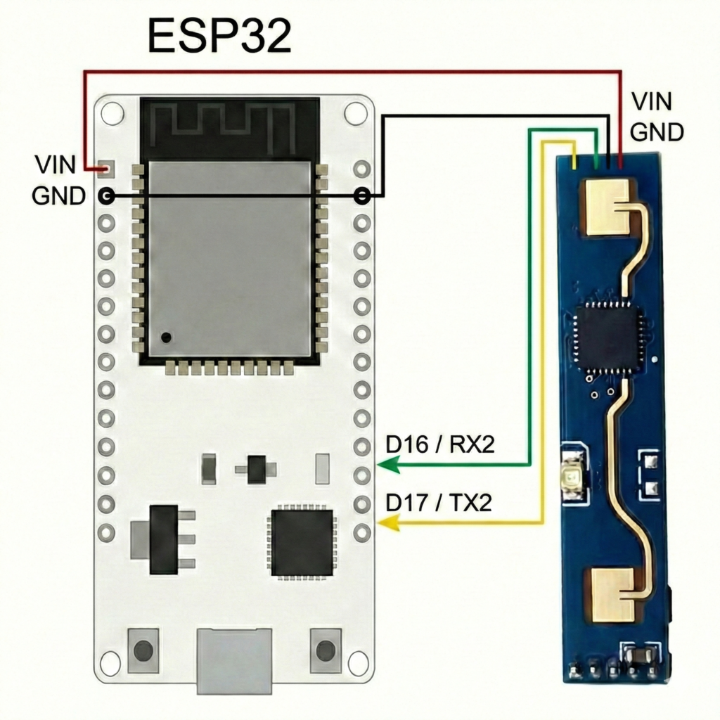 Para que el ESP32 interprete los datos del radar, debes cargar un código específico. Te recomiendo conectar el dispositivo directamente a tu ordenador mediante USB la primera vez.